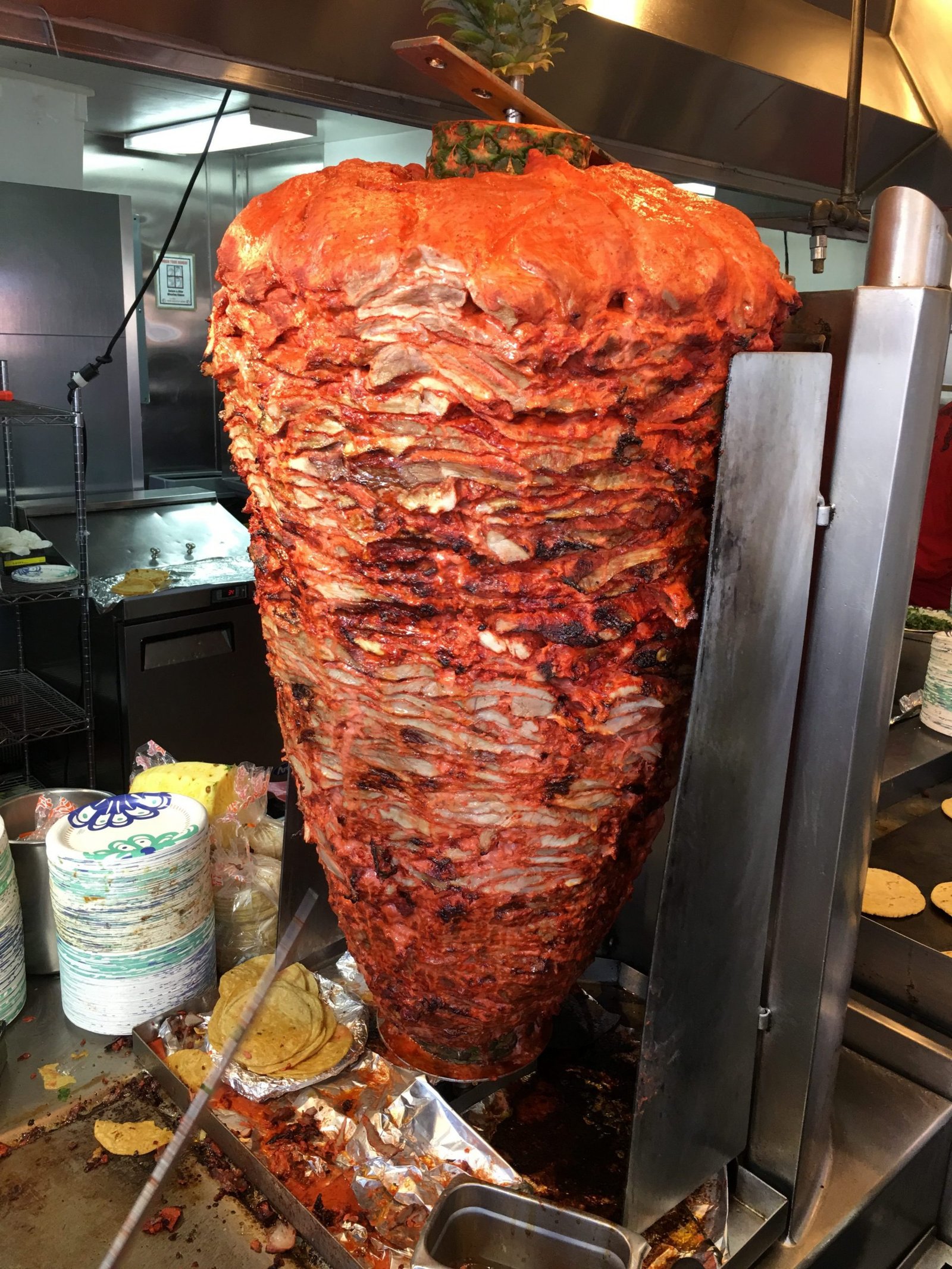It’s traditionally cooked on a vertical spit (trompo), a technique brought to Mexico by Lebanese immigrants—similar to shawarma.